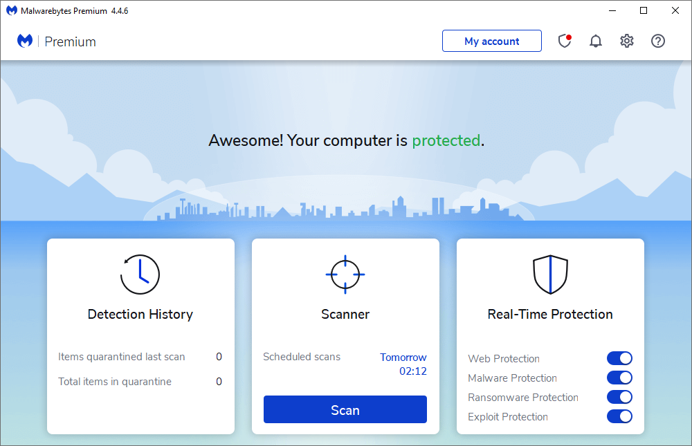 Malwarebytes incluye cuatro capas de protección adicional en tiempo real: antimalware, antiexploits, antiransomware y protección web. Todos estos pueden activarse o desactivarse según sea necesario a través de interruptores claramente visibles en la interfaz principal del programa. Es claro, simple e incluye acceso a un escáner manual (que también se ejecuta en un horario).