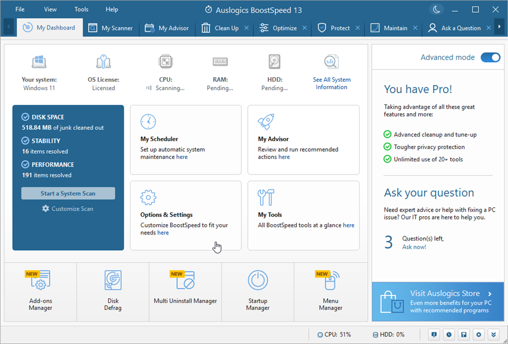 Auslogics BoostSpeed 13 Pro brinda a los usuarios acceso a 15 herramientas adicionales, que incluyen anti-tracker, desfragmentación inteligente, herramientas de limpieza más exhaustivas y la capacidad de cambiar entre los modos básico y avanzado. La edición Pro también permite a los usuarios programar tareas de mantenimiento para la optimización del sistema manos libres.