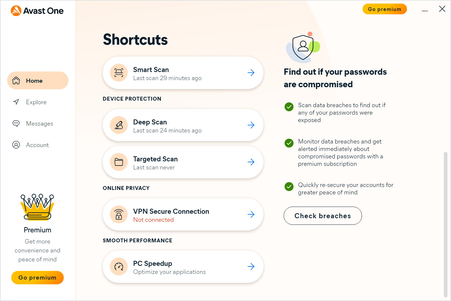 En total, hay tres ediciones de Avast One para elegir. Avast One Essentials es la versión gratuita e incluye una VPN con una asignación semanal de 5 GB, monitoreo de violación de datos, Ransomware Shield, un firewall integrado y el componente PC Speedup. Subir de nivel lo lleva a Avast One Individual, que le brinda la misma protección de VPN, pero sin limitaciones.