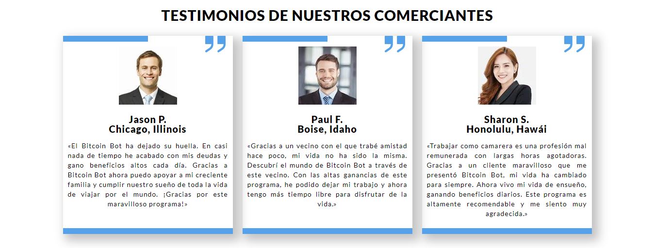 Según numerosos profesionales del comercio y consumidores, Bitcoin Bot tiene una tasa de éxito del 99% y es una plataforma de comercio de criptomonedas segura y rentable. Con un compromiso mínimo de $250, Bitcoin Bot da un buen potencial de hacer un beneficio sustancial; sin embargo, usted puede invertir más para aumentar sus ganancias.