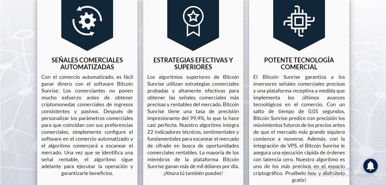 En el sitio web de la plataforma, hay muchas afirmaciones sobre su validez y detalles sobre las grandes ganancias que se pueden obtener operando con bitcoin a través de este programa basado en la aplicación «Bitcoin Sunrise».