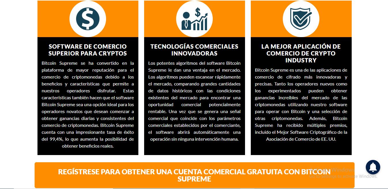 La aplicación Bitcoin Supreme es una de nuestras favoritas porque permite que tanto los operadores expertos como los novatos participen en el comercio de bitcoins. El extraordinario éxito del sistema asombrará a cualquier trader que haya tenido problemas anteriormente para navegar de forma rentable por el mercado de bitcoins. También nos gusta la interfaz de la plataforma, que hace que sea fácil de navegar para cualquier persona.