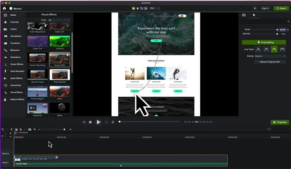 Las mejoras clave en el manejo del cursor de Camtasia se abren con su capacidad para capturar de forma inteligente información sobre la posición del cursor y la ruta en pantalla durante la grabación.