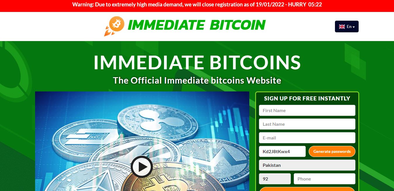 Immediate Bitcoin es una plataforma de trading totalmente automatizada. La función de piloto automático es lo que le atrae: ¡no necesita ningún conocimiento previo de trading para probarlo! Al hacer clic en el botón de la interfaz de comercio se inicia el comercio en vivo. El robot de comercio de Bitcoin analiza el mercado de criptodivisas en busca de las mejores ofertas durante esta sesión de comercio en vivo.