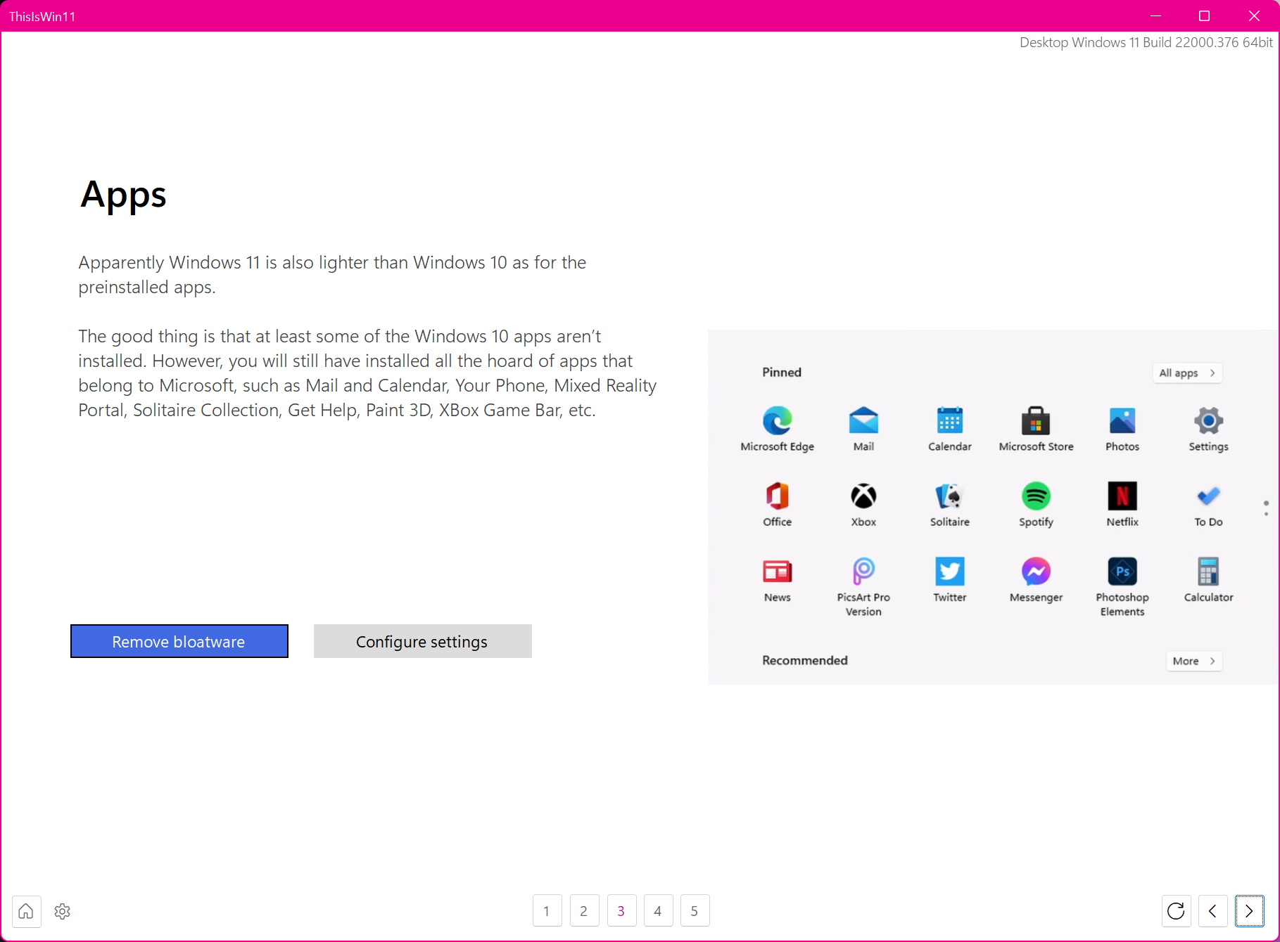 A medida que avanza en la presentación, aprendiendo todo lo que el sistema operativo tiene para ofrecer, la interfaz incluye prácticos puntos de partida. Entonces, por ejemplo, cuando esté aprendiendo sobre las aplicaciones integradas que ofrece Windows 11, encontrará un botón que lo llevará a la herramienta de eliminación de bloatware de ThisIsWin11, así como un enlace a la aplicación de configuración integrada.