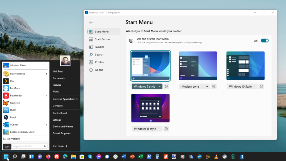 Open Shell atraerá a aquellos que buscan un menú al estilo de Windows 7, pero no es una solución tan elegante como Start 11. Por ejemplo, después de habilitarlo y elegir su ícono, verá que simplemente coloca su propio botón en la parte inferior esquina izquierda, lo que significa que solo puede usarlo junto con el menú Inicio existente en lugar de como un reemplazo. Si desea explorar la posibilidad de usar Open Shell en lugar del botón Inicio de Windows 11, consulte esta publicación del foro para obtener más detalles.