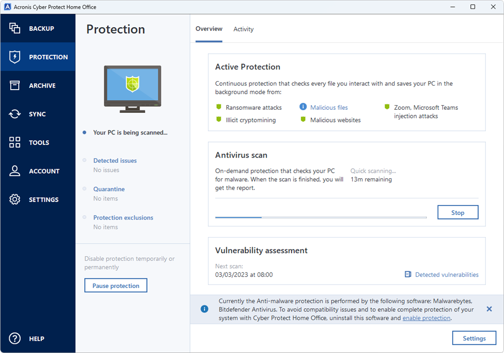 Acronis Cyber ​​Protect Home Office 2023 Advanced también ofrece una protección integral contra malware.