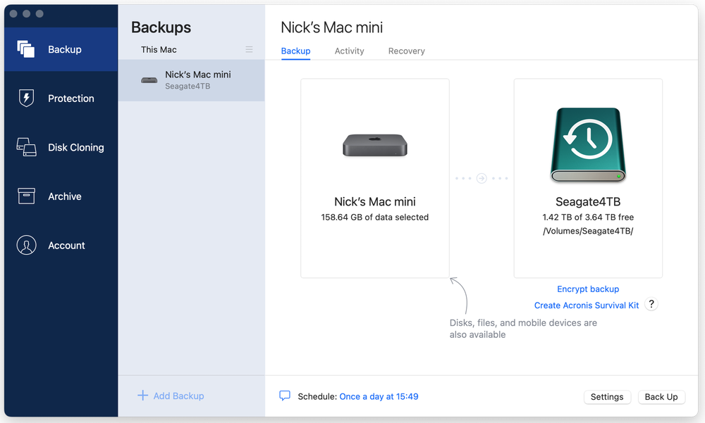 Las copias de seguridad se pueden programar para que se ejecuten automáticamente en segundo plano y, de forma predeterminada, Acronis está configurado para minimizar el tamaño de las copias de seguridad futuras al registrar solo los cambios realizados desde que se realizó la última copia de seguridad.