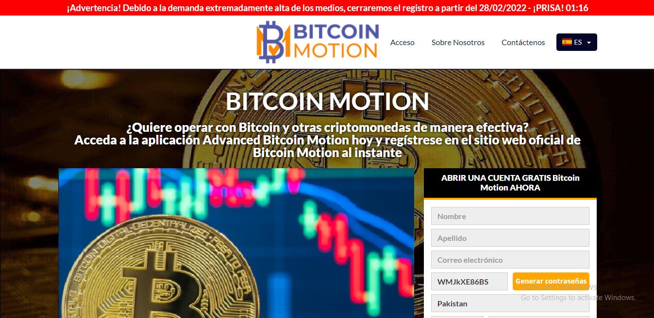 Bitcoin Motion , un conocido robot de comercio, emplea una tecnología de vanguardia que permite a cualquier persona sin experiencia previa en el comercio o habilidades para entrar en el mercado. El objetivo de Bitcoin Motion es mejorar el trading. Cada paso del proceso está cubierto, desde el registro hasta el envío de dinero.
