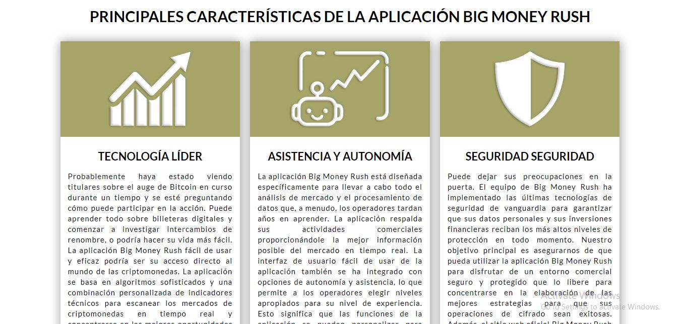 Mientras sus patrocinadores financieros estén contentos, es perfectamente aceptable que usted maneje su propio dinero. Debido a esto, Big Money Rush ha demostrado ser la herramienta ideal para obtener enormes beneficios en el comercio de criptodivisas. Los operadores pueden utilizar un bot en la aplicación para organizar y mostrar los datos del mercado. Estos datos son utilizados constantemente por el mercado. Los clientes de Big Money Rush informan de que sus operaciones paso a paso son 100% precisas. El producto permite al comprador sentarse y observar el estado actual del mercado. No es que se esté enfrentando a un software de comercio cuando utiliza Big Money Rush , que tiene su propio conjunto de reglas y objetivos.