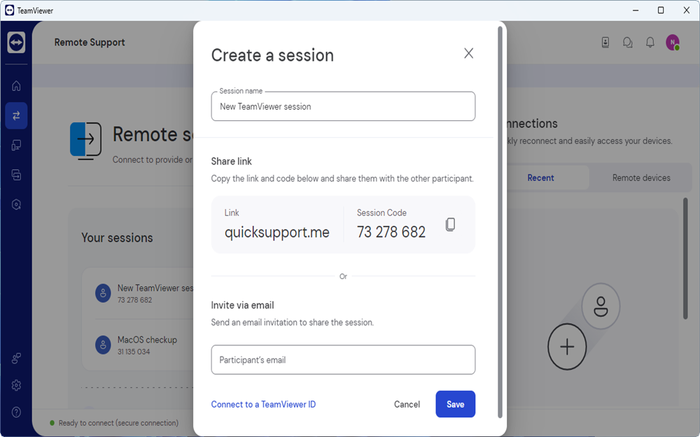 Los expertos asignan a la sesión un nombre descriptivo adecuado y luego eligen si desean compartir un enlace de sesión en el que se puede hacer clic o un código numérico con el usuario final. A su vez, pueden unirse a la sesión haciendo clic en el enlace proporcionado o ingresando el código de la sesión en su propia instancia de TeamViewer Remote.