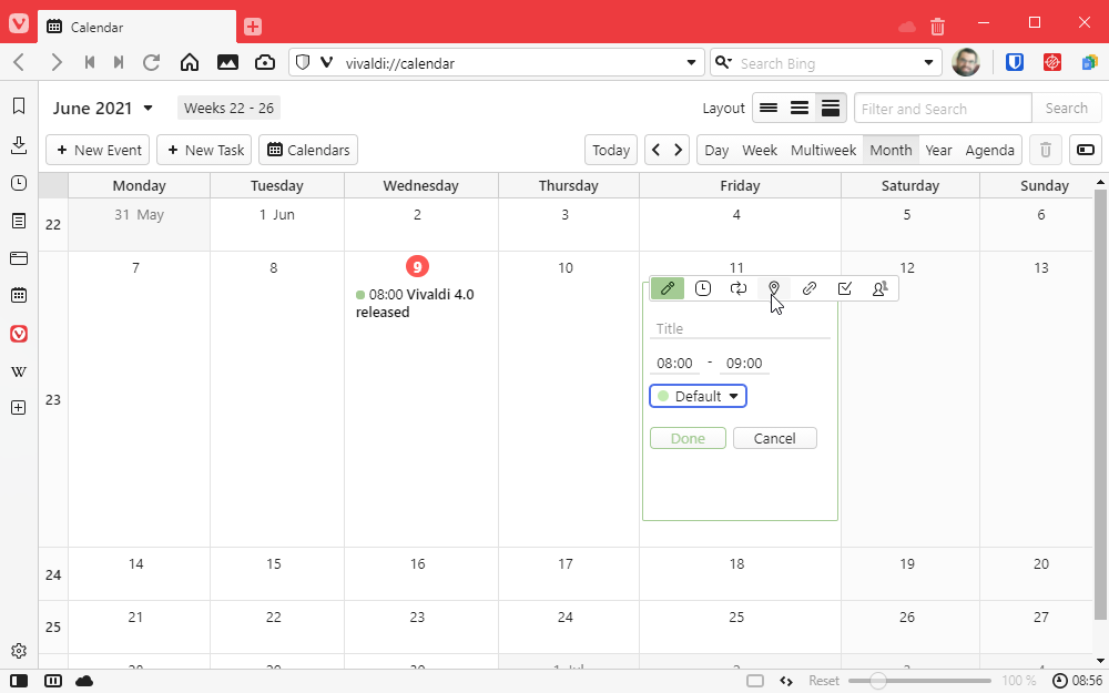 Vivaldi Calendar funciona como cualquier buen calendario y se integra con el navegador a través de un editor de eventos y comandos rápidos. Se admite una variedad de servicios de calendario en línea (incluida una opción alojada en Vivaldi) junto con servidores CalDAV, o los usuarios pueden optar por mantener su calendario fuera de línea y privado dentro de Vivaldi.