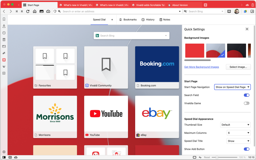 Vivaldi 5.1 también agrega un panel de Configuración rápida a la página de inicio para personalizarlo rápidamente: haga clic en el icono de la rueda dentada en la esquina superior derecha para acceder a las opciones que abarcan la imagen de fondo, los elementos de la página de inicio y la apariencia de marcación rápida.
