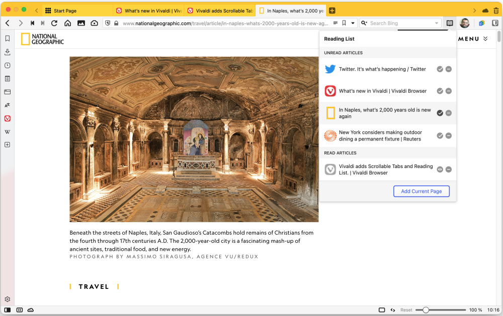 Vivaldi 5.1 se abre con una nueva función de Lista de lectura que no requiere registrarse en un servicio de terceros: los usuarios simplemente deben hacer que el botón Lista de lectura sea visible a través de la sección Barra de direcciones de Configuración. Una vez hecho esto, haga clic en el botón para ver el contenido guardado previamente y agregue la página actual a la lista (a través del botón ‘Agregar página actual’).